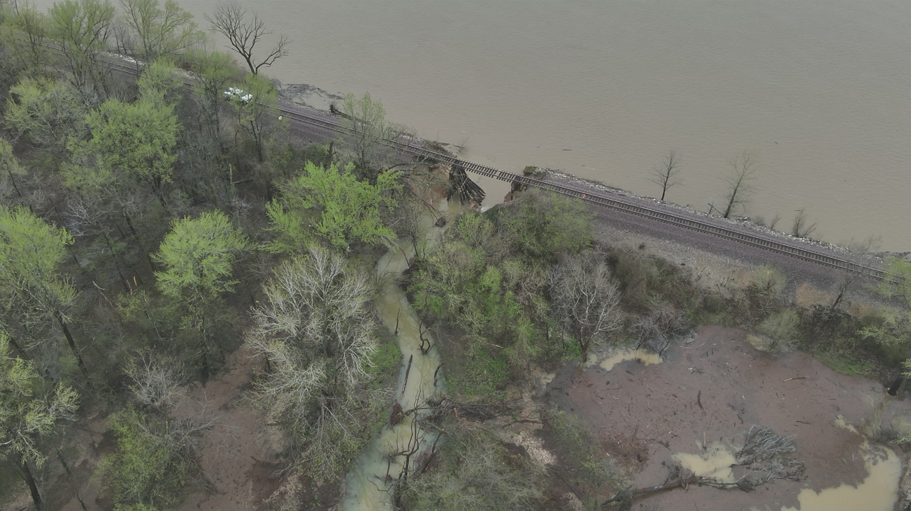 Damage to mainline track approximately 100 miles south of St Louis - River Subdivision - April 6, 2025