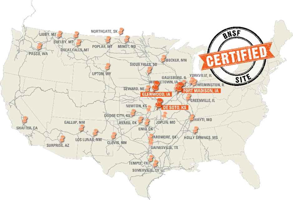 FORT WORTH, Texas – Today, BNSF Railway Company awarded three new locations for its Certified Sites designation. The newly designated sites, located in Fort Madison, Iowa, Glenwood, Iowa, and De Soto, Kansas, feature acreage ready for industrial development. The Certified Sites program is a strategic approach that addresses the increasing demand for customer site locations by developing various types of facilities across BNSF’s network.