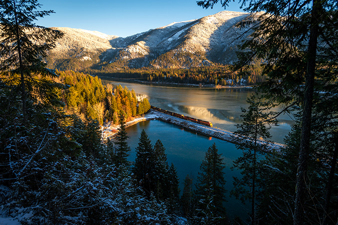 With a light blanket of snow and bright morning sunlight covering the mountains near Noxon, Montana, an eastbound train passes the Clark Fork on a chilly December day.