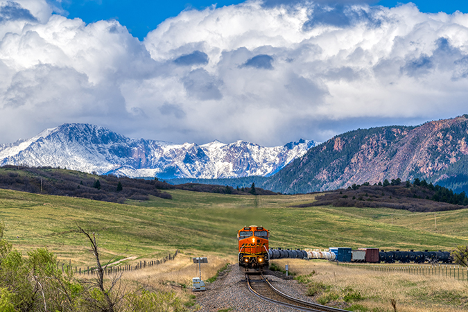 “A BNSF mixed freight train begins its ascent near Greenland, Colorado, with Pikes Peak looming in the distance.”