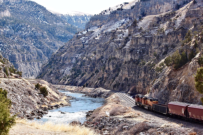 “A southbound BNSF grain train heads into the Wind River Canyon in eastern Wyoming.”