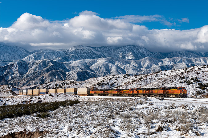 "BNSF’s Los Angeles, Calif. to Willow Springs, Ill. priority intermodal train combats the grade on California’s famed Cajon Pass as a winter storm clears out on December 29, 2020."