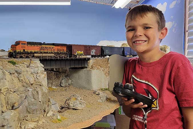 Tyler’s Dad: I have been a railfan most of my life. Both of my sons were into trains, my oldest just a few years, but Tyler's admiration of trains has only grown. It started for Tyler around the age of 3. As a young toddler, he would ask me to go see trains. I was into photography at the time, so he got plenty of opportunities. However, for Christmas of 2020 he wanted a train set. By February, he had me hooked on model railroading. Thousands and thousands of dollars later we have a nice 10-foot by 16-foot shed full of trains. He usually runs the trains when we have guests over.