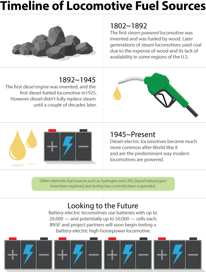 In 2018, BNSF and Wabtec (formerly GE Transportation) joined forces to begin developing a 100-percent battery-electric road locomotive prototype that works with conventional diesel locomotives to make a battery-electric hybrid consist. (Consist refers to when two or more locomotives are coupled together.) Performance testing of the hybrid is expected to begin in late 2020.