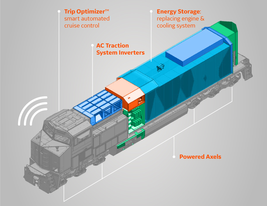 “The battery will recover energy through dynamic braking,” Cleveland explained. (Dynamic braking is where the kinetic energy of a moving train is used to generate electric current at the locomotive’s traction motors.) “Essentially, every time dynamic braking is used to slow and control train speed, the battery will refill its energy reserves, which is unlike anything today’s diesel-powered locomotives can do.”