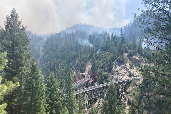 “This fire is very much alive. It’s burned across the Gateway Subdivision at several locations, caused a tunnel to collapse and destroyed two of our bridges,” said General Director Line Maintenance Danniel MacDonald, Engineering, who has helped lead BNSF’s effort to minimize impact and restore operations since the fire was reported in mid-July.