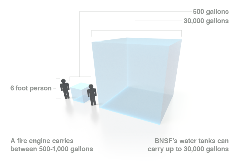 In addition to getting firefighters to places firetrucks can’t access and where there are no water sources, the fire trains contain significantly more water; a firetruck averages 500 gallons of water, the train’s tanks carry 30,000.