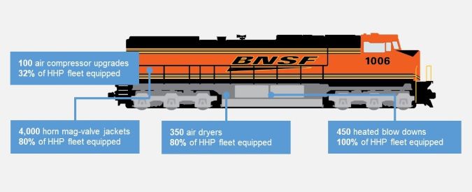Over the past six years, BNSF has invested in various winterization modifications such as air dryers, heated blowdowns, and horn mag-valve jackets to tackle the ever-increasing winter challenges. Also, every autumn, all locomotives go through a series of checks during maintenance to ensure that all the key winter components are in good order and functioning as intended. A locomotive that has gone through the winter modifications, along with the winter checks, is a winter-weather veteran and ready for the season ahead.