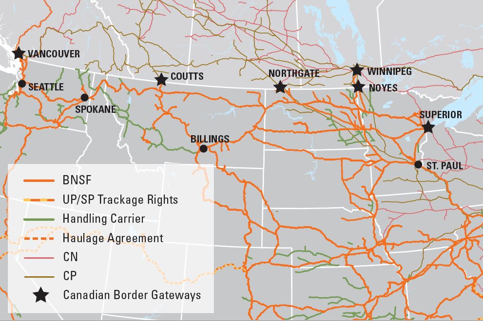 • BNSF has direct access to Canada in three provinces: British Columbia, Saskatchewan and Manitoba, with five gateways and a dozen interchange locations with either Canadian National (CN) or Canadian Pacific (CP) railroads. Through these portals and connections, Canadian customers can link to BNSF’s 32,500-route-mile network – a system that is larger than Canada’s entire rail network. In addition, BNSF connects to key shortline railroads in British Columbia: the Southern Railway of British Columbia at Sumas, Wash., and the Kettle Falls/St. Paul and Pacific Railroads at Chewelah, Wash.